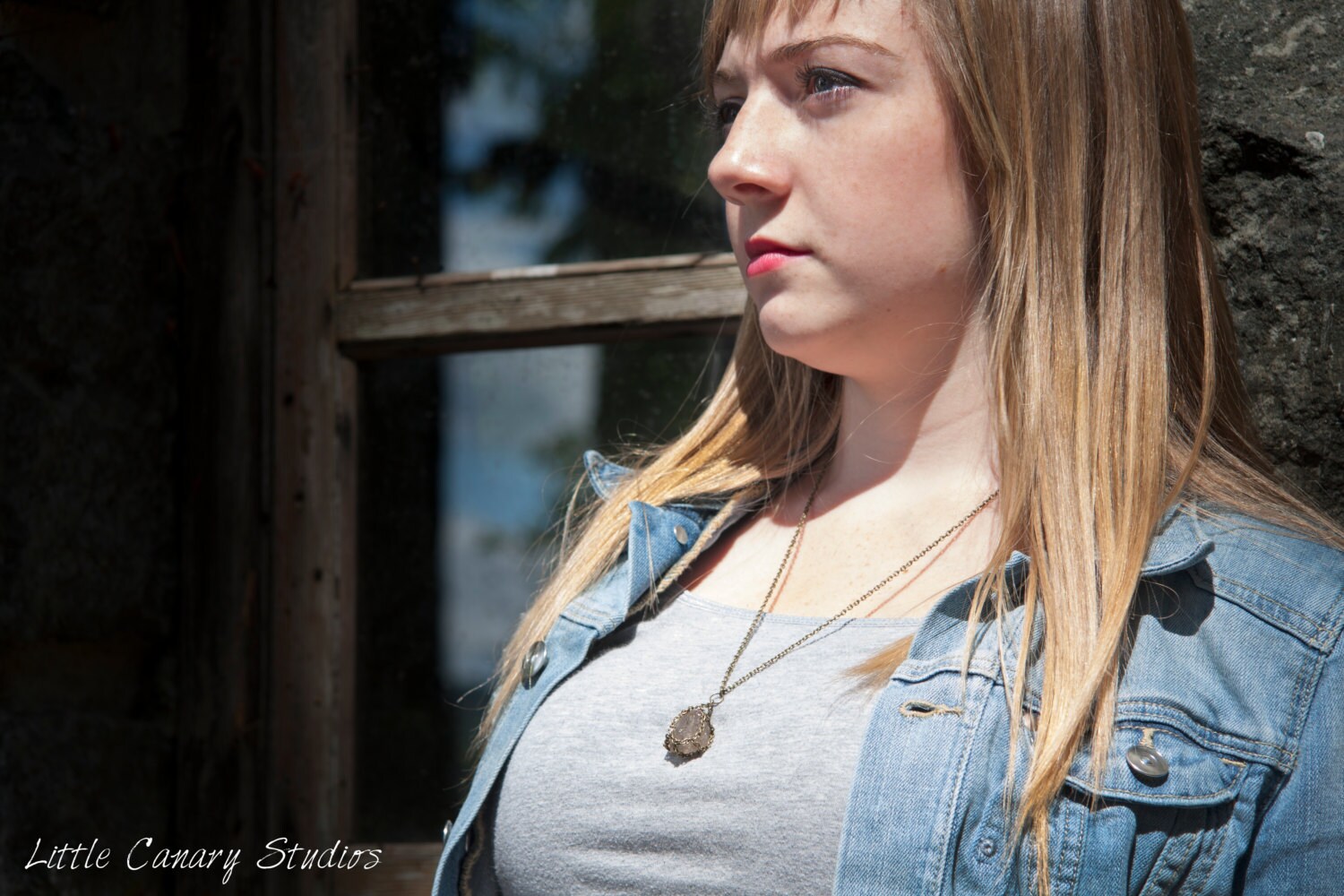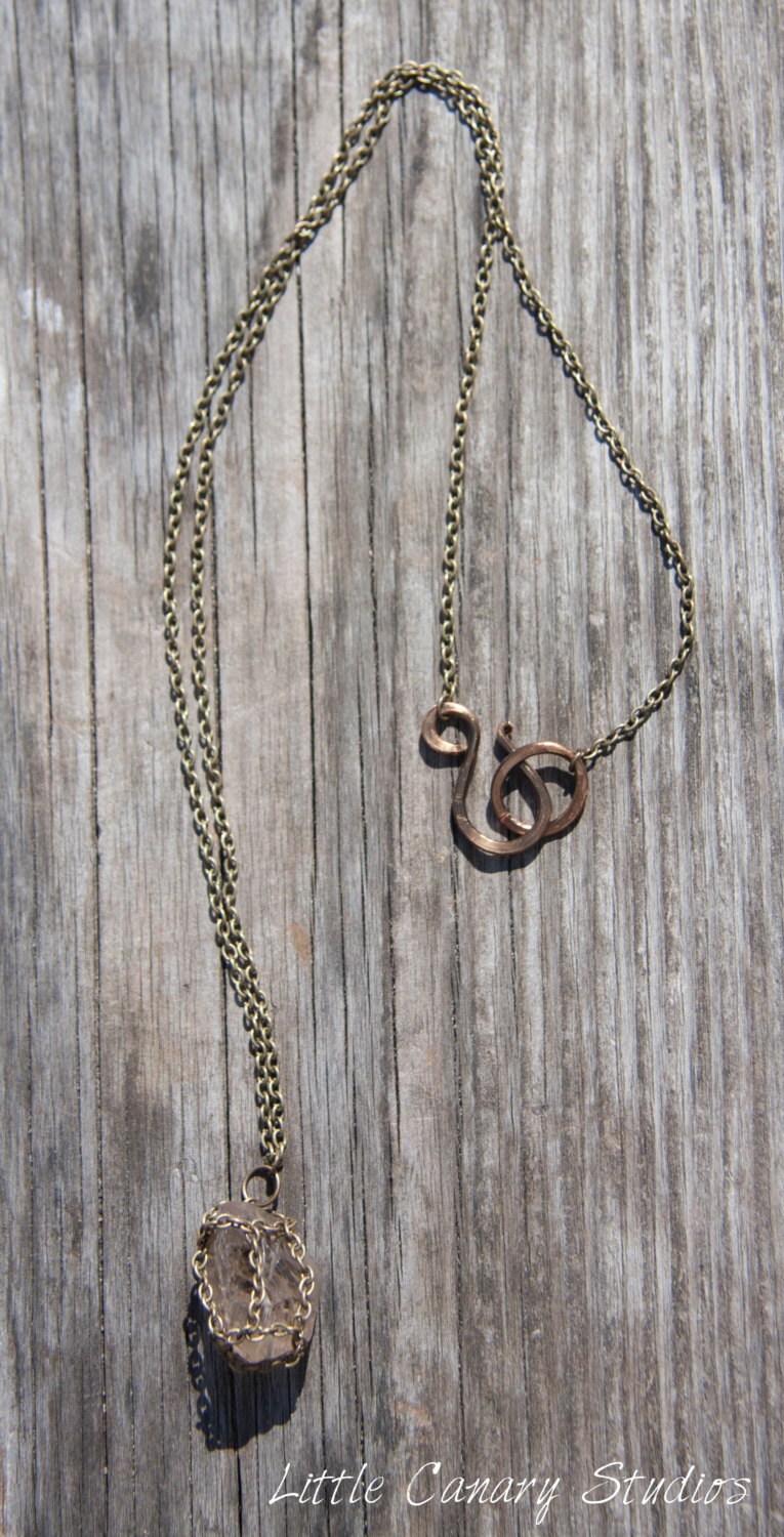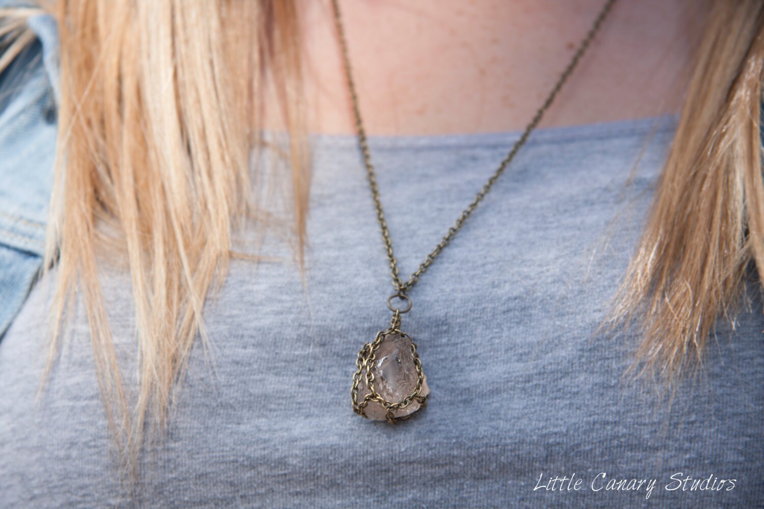 Smokey quartz crystal wrapped with antiqued brass chain.