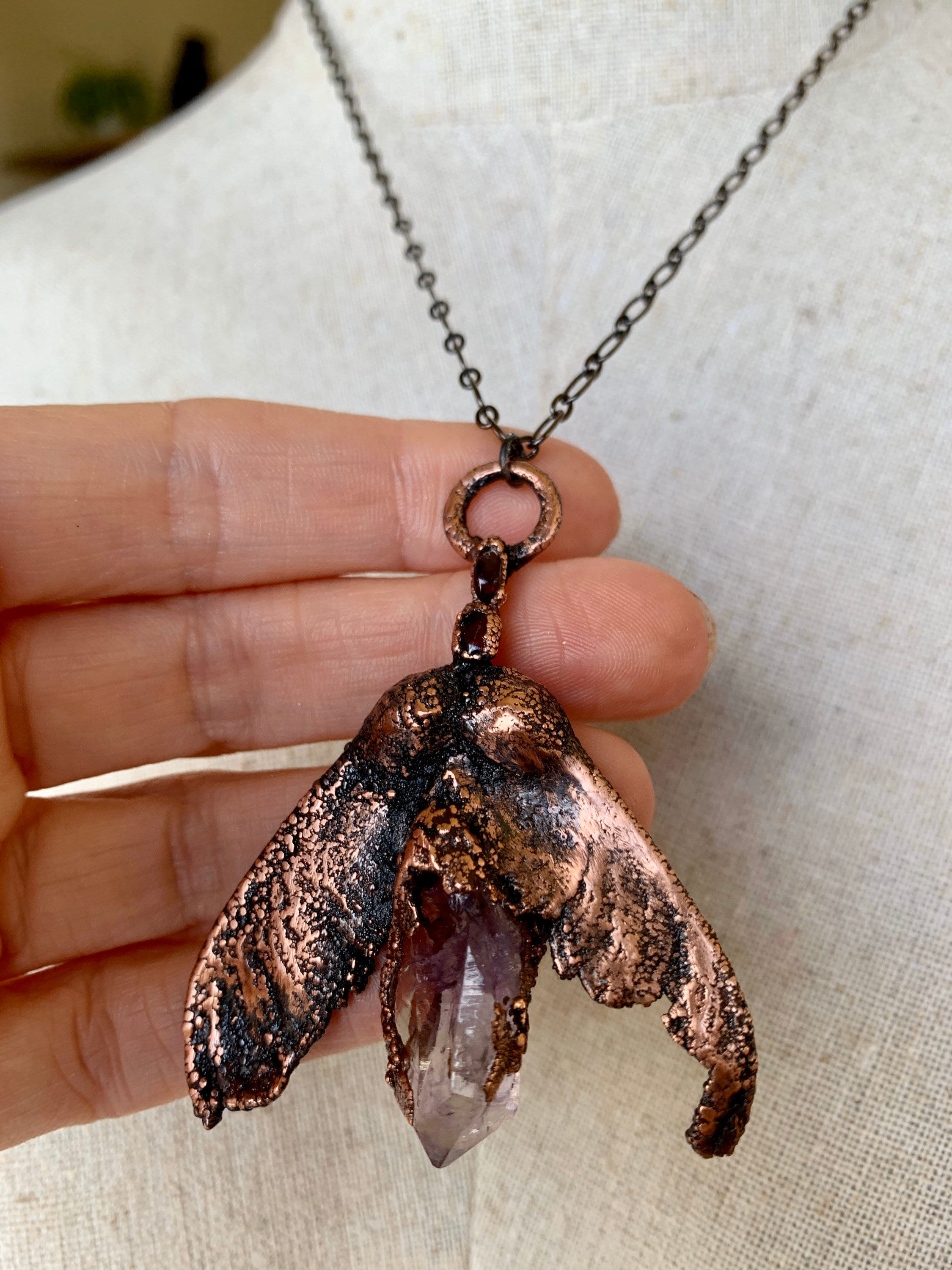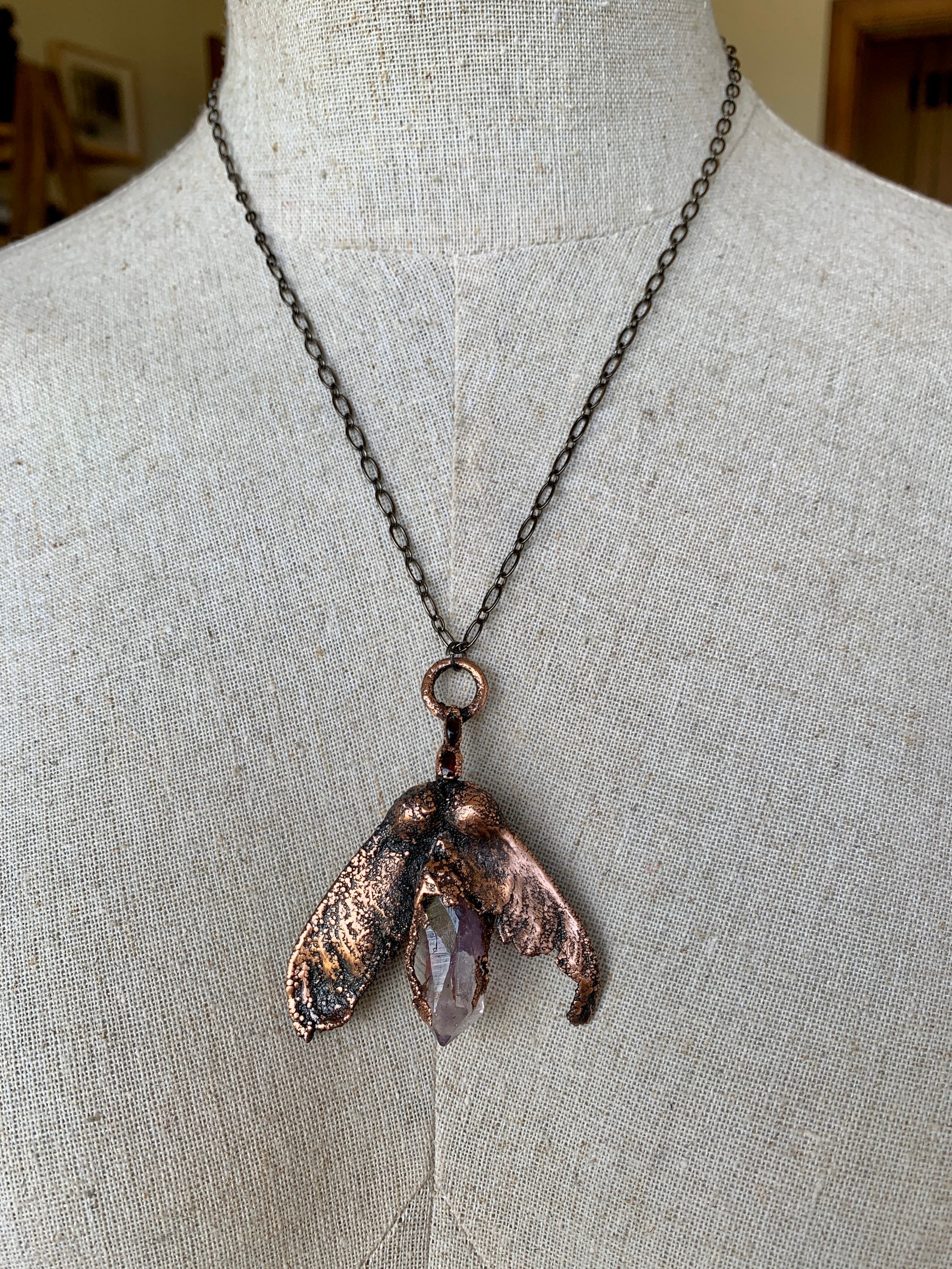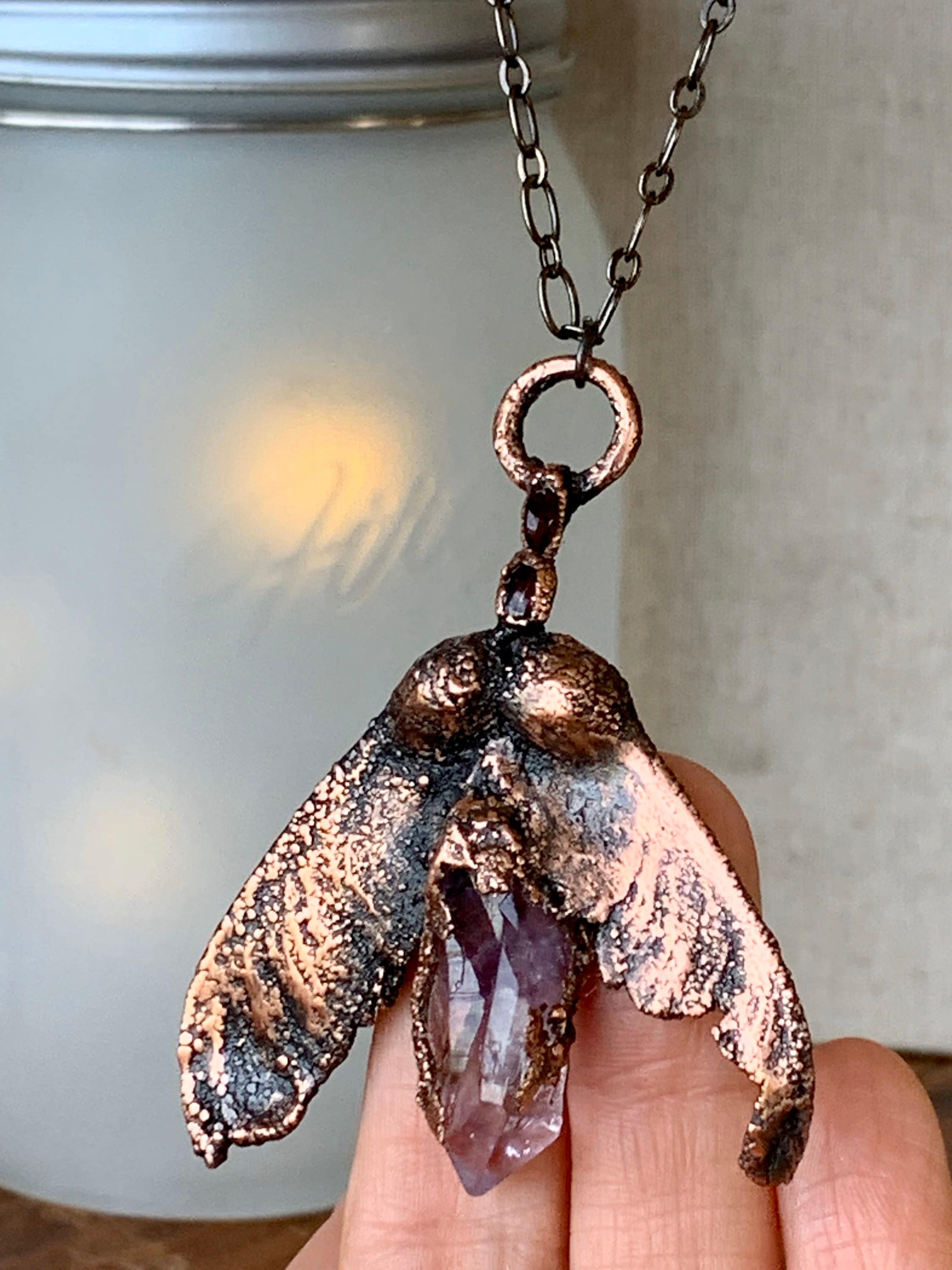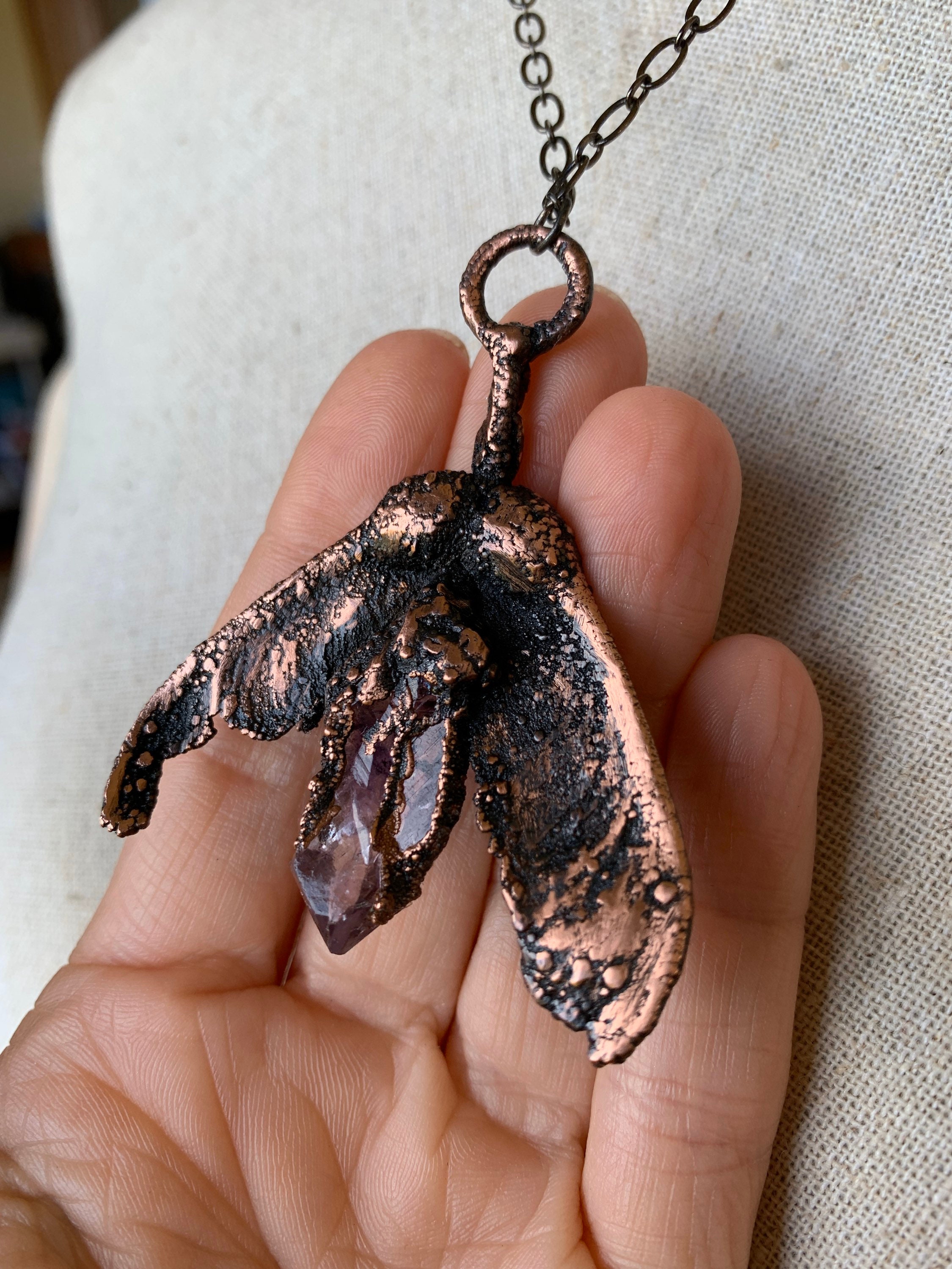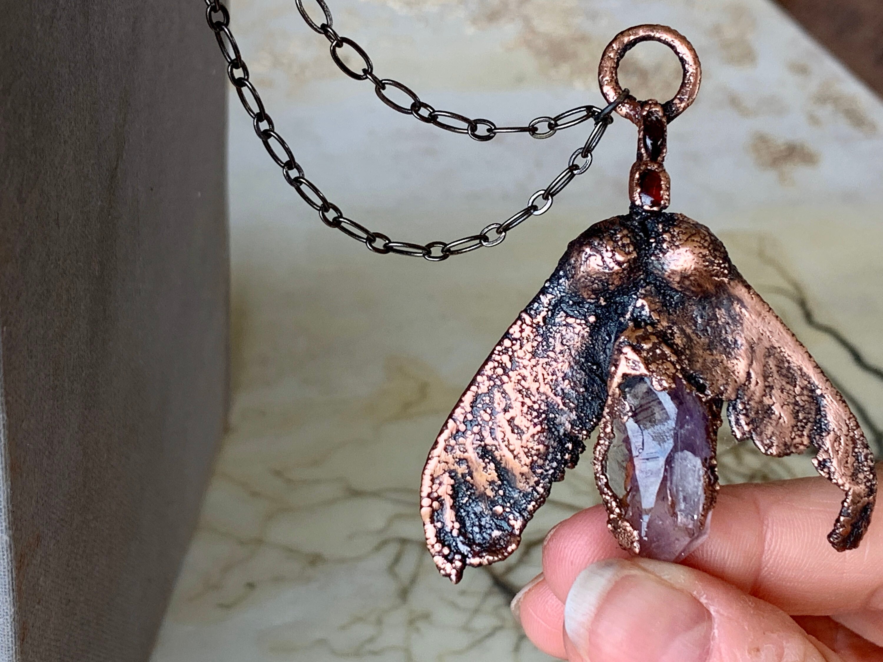Moth necklace, amethyst and a real maple key that is electroformed in copper. Little garnets run up the neck.