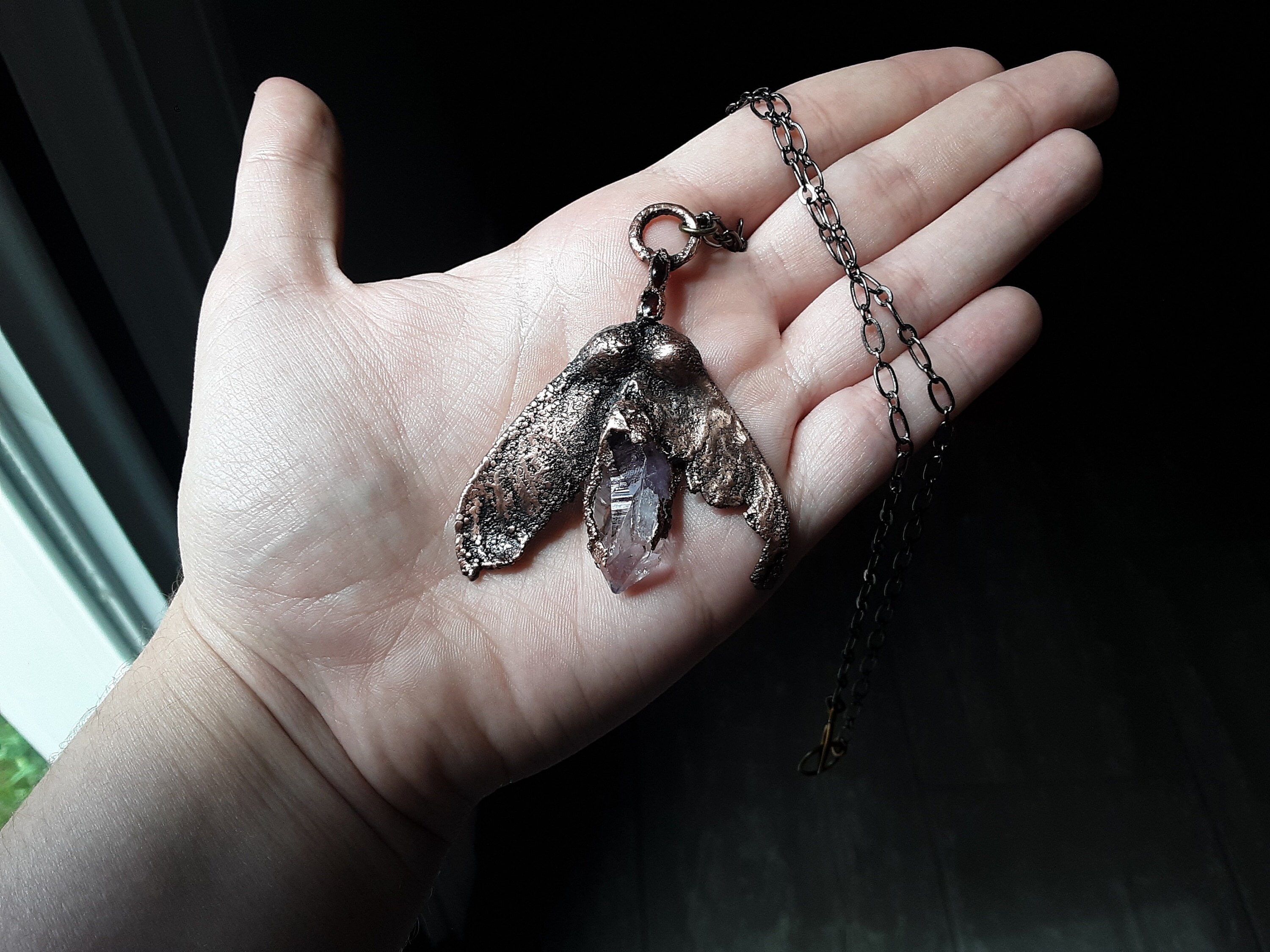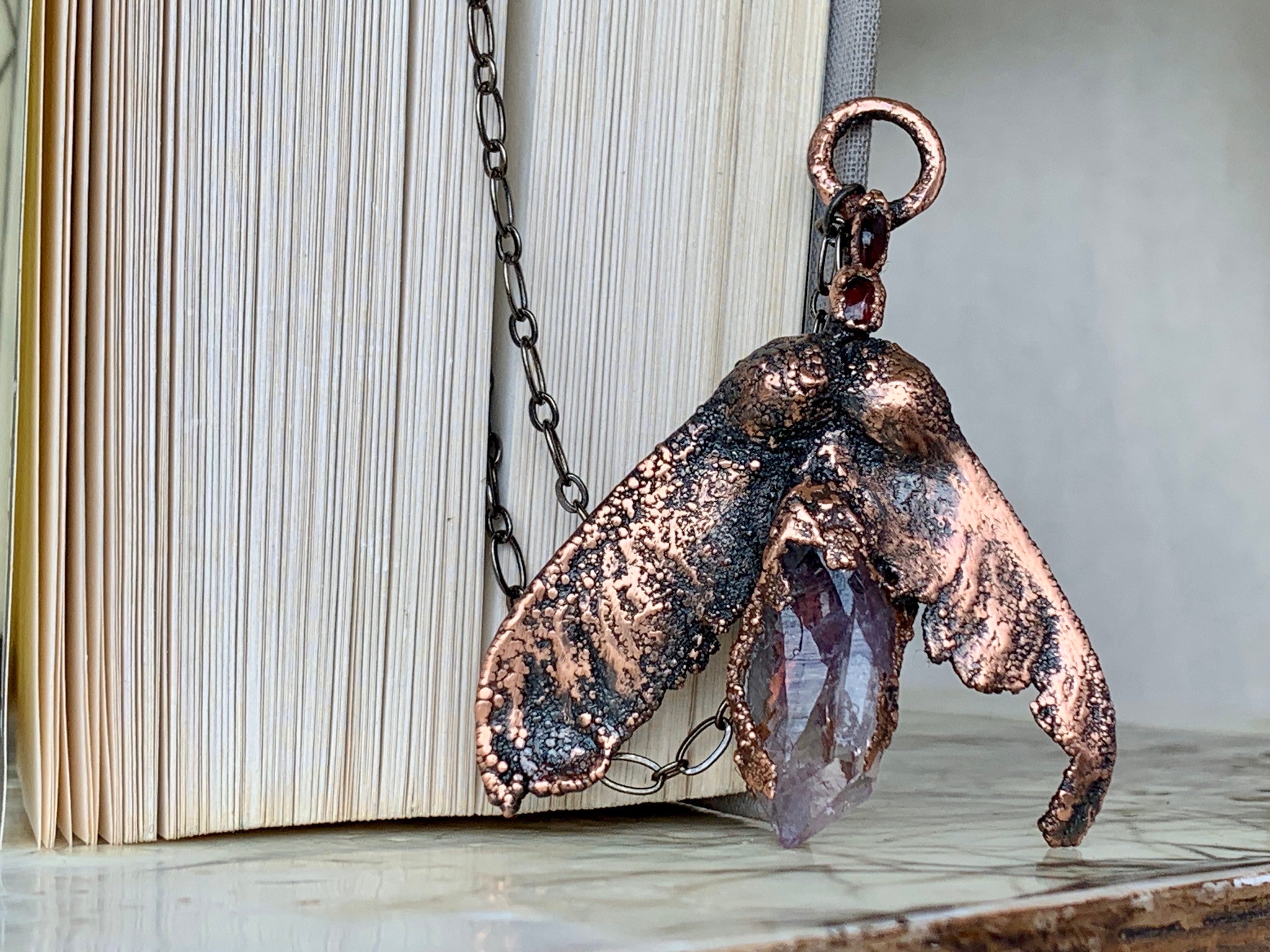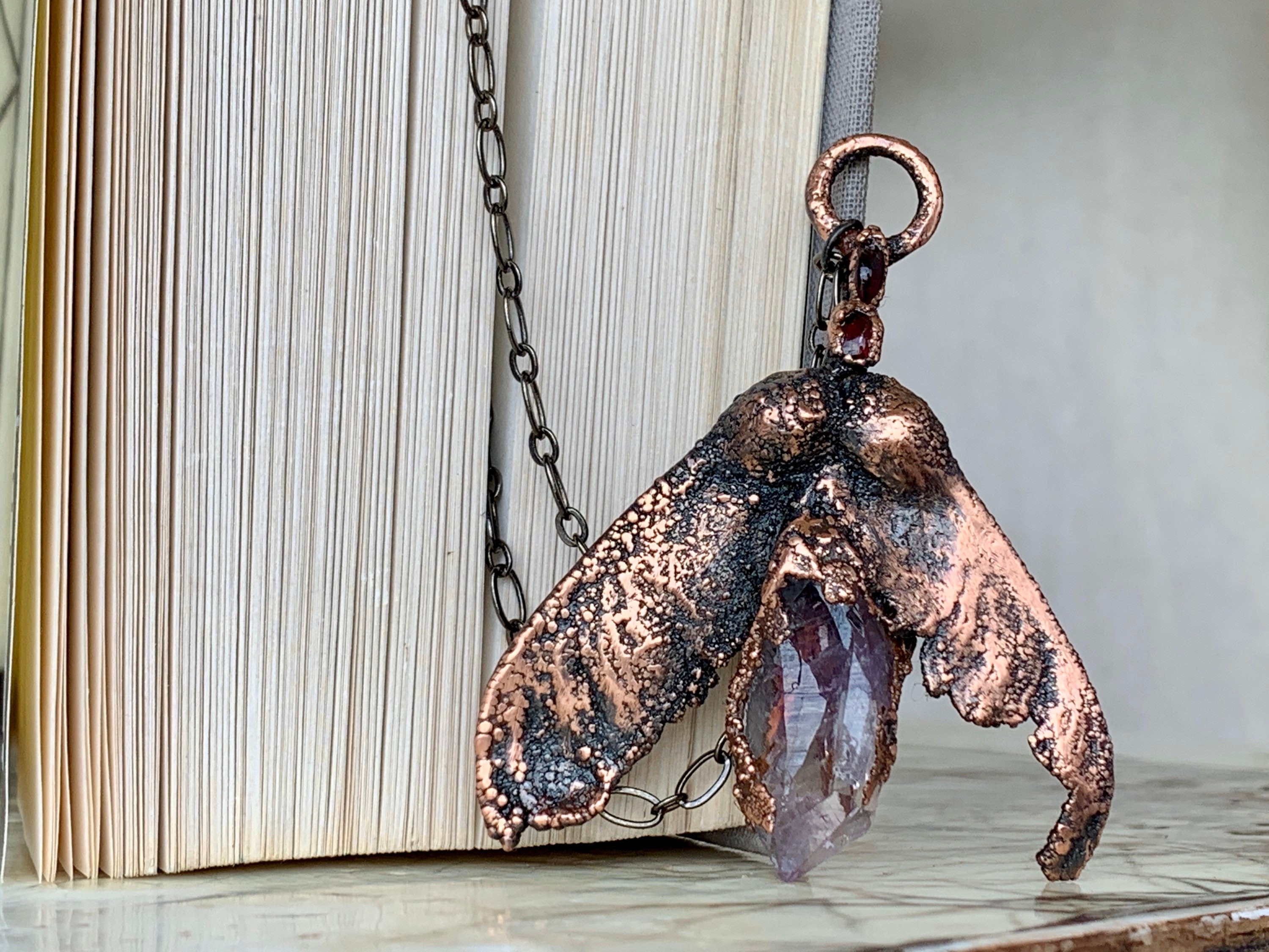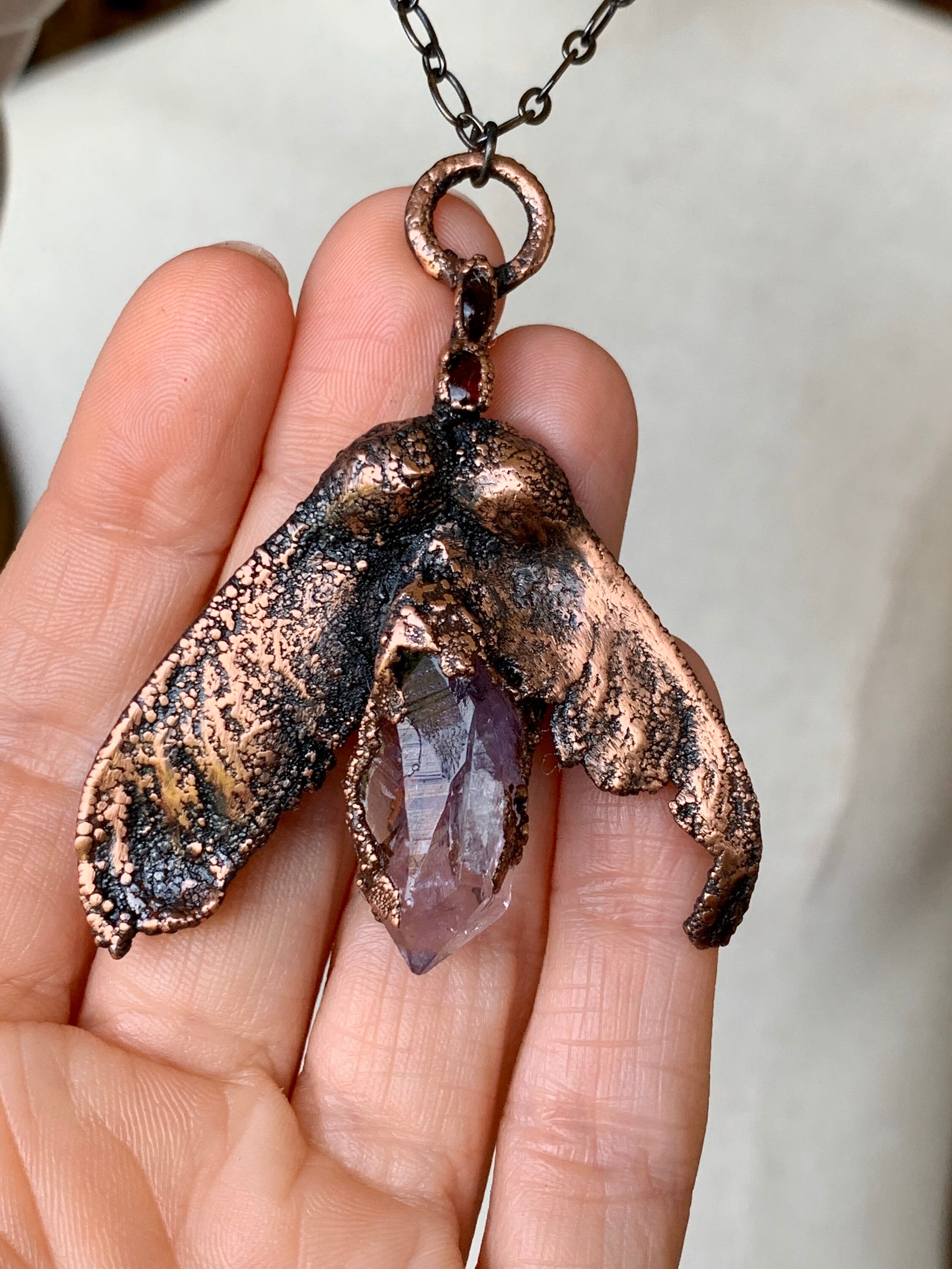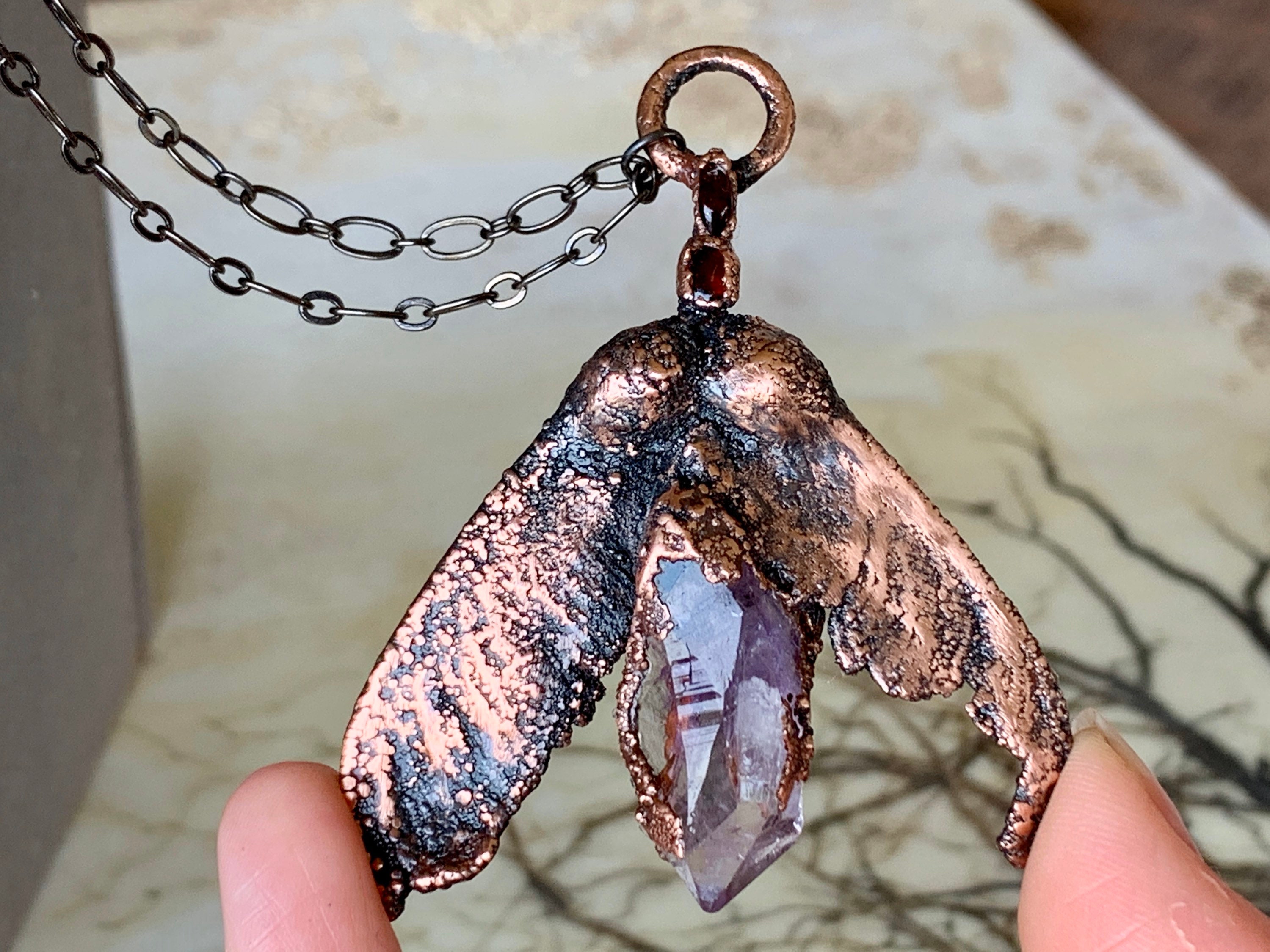 Moth necklace, amethyst and a real maple key that is electroformed in copper. Little garnets run up the neck.